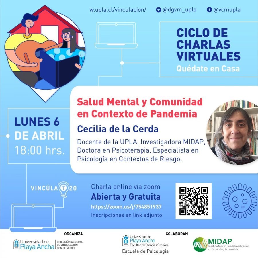 Iniciará este ciclo la psicóloga y Dra. en Psicoterapia, Cecilia de la Cerda, quien además es académica de la carrera de Psicología de la UPLA e investigadora del Instituto Milenio para la Investigación en Depresión y Personalidad (MIDAP), con la charla titulada “Salud Mental y Comunidad en Contextos de Pandemia”.
