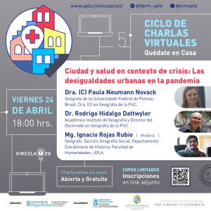 Esta vez la temática será “Ciudad y salud en contexto de crisis: Las desigualdades urbanas en la pandemia” a cargo de la Dra © en Geografía de la Universidad de Pelotas, Brasil, Paula Neumann Novack, junto a Rodrigo Hidalgo Dattwyler, Director del Doctorado en Geografía de la Pontificia Universidad Católica de Chile, los que serán acompañados en la moderación por el académico del Departamento Disciplinario de Historia de la Facultad de Humanidades, Ignacio Rojas Rubio.