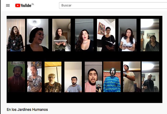 Uno a uno fueron ingresando al escenario virtual, que actualmente brinda Youtube, los 15 integrantes del Conjunto de Madrigalistas de la Universidad de Playa Ancha para dar vida -desde sus casas- al tema “En los jardines humanos” de Violeta Parra.