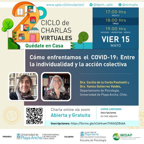Reflexionar sobre cómo enfrentamos colectivamente esta pandemia en el sentido de que necesitamos de los otros y cómo se vive en confinamiento en los distintos territorios es uno de los objetivos de la charla “Cómo enfrentamos el COVID-19: Entre la individualidad y la acción colectiva”, la cual será impartida por las académicas del Departamento de Psicología de la Facultad de Ciencias de Sociales de la Universidad de Playa Ancha, Dra. Cecilia de la Cerda Paolinelli y Yanina Gutiérrez Valdés, este viernes 15 de mayo, a las 18:00 horas, vía Zoom.