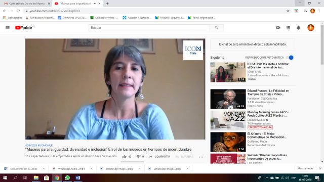 El encuentro titulado «Museos para la igualdad: Diversidad e Inclusión. El rol de los museos en tiempos de incertidumbre», apuntó a debatir a sobre la cuestión de la igualdad en los museos que apunta a promover la inclusión en todas las áreas de actividad de los museos e incorporar el debate sobre la diversidad cultural. Justamente ese fue el tema abordado por la Dra. Javiera Carmona Jiménez, académica de la Facultad de Ciencias Sociales de la UPLA y representante del MUG, en un encuentro virtual junto a los especialistas Cintia Velázquez, México y Eduardo Ribotta, Argentina.