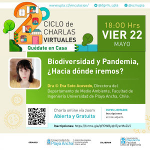 “Biodiversidad y pandemia: ¿Hacia dónde iremos?” es la pregunta que tratará de responder la Dra. © Eva Soto Acevedo, directora del Departamento Disciplinario de Medio Ambiente de la Facultad de Ingeniería en una sesión virtual del ciclo de charlas “Quédate en Casa”, que organiza la Dirección General de Vinculación con el Medio de la Universidad de Playa Ancha.