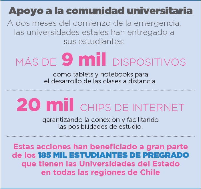 Además, se han facilitado ayudas económicas y entregado más de 9 mil dispositivos como tablets y notebooks, cubriendo así a todos los y las estudiantes que necesitaban este tipo de apoyos, dejando en evidencia el fuerte compromiso social que tienen las universidades públicas y la convicción de la equidad como un valor fundamental.