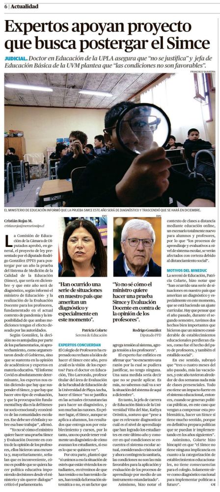 La Comisión de Educación de la Cámara de Diputados aprobó, en general, el proyecto de ley presentado por el diputado Rodrigo González (PPD) para postergar por un año la prueba del Sistema de Medición de la Calidad de la Educación (Simce), que sería en diciembre -y que este año será de diagnóstico, según informó el ministro de Educación- y la realización de la Evaluación Docente para los profesores, fundamentado en el actual contexto de pandemia y la imposibilidad de que ambas mediciones tengan el efecto deseado por las autoridades.