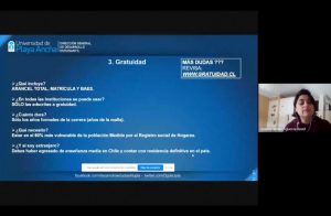 Con el objetivo de brindar información, orientar y resolver dudas de los escolares del Valle del Aconcagua en torno al acceso a la gratuidad y beneficios estudiantiles para la Educación Superior ofrecidos por el Ministerio de Educación, la Dirección de Desarrollo Estudiantil del campus San Felipe, dependiente de la Vicerrectoría Académica de la Universidad de Playa Ancha, dio inicio a un ciclo de charlas virtuales dirigidas a alumnos de cuartos medios que desean ingresar a una carrera profesional o técnica al culminar su etapa escolar.