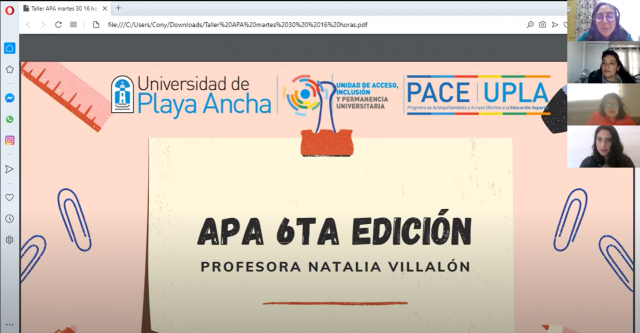 Con una participación promedio de 350 personas, entre estudiantes y académicos, el PACE-UPLA perteneciente a la Unidad de Acceso, Inclusión y Permanencia Universitaria (UAIP) realizó un taller introductorio a las Normas APA, sexta edición.