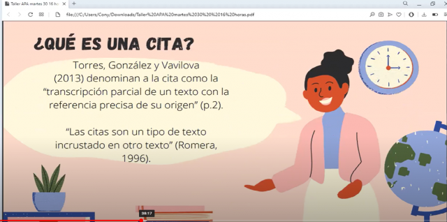 El taller se basó principalmente en mostrar que indican las Normas APA, sexta edición, en cuanto a citas y algunos ejemplos de referencias bibliográficas. Además, en colaboración con la biblioteca de nuestra institución, se promovió la utilización de los materiales dispuestos en su sitio web para la realización de trabajos de investigación y diferentes normas de citación existentes.