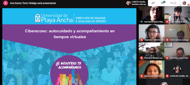 En el taller se presentaron tres relatoras: Ann Timm Hidalgo, directora de Equidad e Igualdad de Género, quien abordó el tema desde los derechos humanos y entregó una perspectiva jurídica sobre el ciberacoso; Alejandra Calderón Martínez, psicóloga, quien expuso sobre las estrategias de autocuidado frente a la violencia en línea y qué hacer frente a ella; y Tania Sandoval Silva, quien se refirió a la seguridad digital, términos de uso y plataformas que permiten un mayor cuidado en internet.