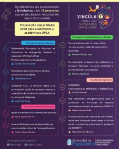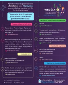 20 proyectos, diez correspondientes a estudiantes y otros diez a académicos y académicas de la universidad, resultaron ganadores de los fondos concursables convocados por la Dirección General de Vinculación con el Medio, los que este año, asumieron el desafío de adaptarse a las condiciones de emergencia sanitaria en que nos encontramos.