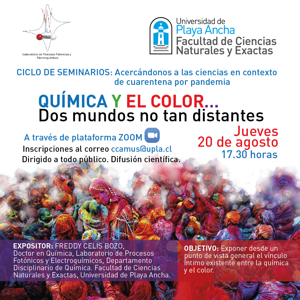 “Química y el color. Dos mundos no tan distantes” será el tema que desarrollará el doctor en química y director del Departamento Disciplinario de Química de la Facultad de Ciencias Naturales y Exactas de la UPLA, Freddy Celis Bozo.