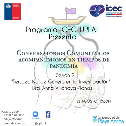 En esta segunda sesión la Dra. Anna Villarroya Palma, abordará la temática “Perspectiva de Género en la Investigación”. Este programa se desarrolla mediante la plataforma Zoom, donde se puede tener una interacción directa con los exponentes y participantes en tiempo real, además de contar con streaming por Facebook Live en la página correspondiente del ICEC-UPLA (https://www.facebook.com/icecupla/) y el canal de Youtube del programa (https://www.youtube.com/channel/UCtWkNtgZRP9vzTyoNWHfEBA), donde quedarán alojados los conversatorios para que la comunidad pueda revisarlos posteriormente.
