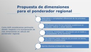 En este escenario, AUR considera pertinente y oportuno debatir la incorporación de más dimensiones en el cálculo del ponderador regional, tales como: la naturaleza y complejidad diferencial de los procesos formativos; las dificultades para formar planteles académicos en regiones, incluyendo retener y atraer talentos; la relación de la docencia, la investigación, vinculación con el medio y las complejidades de los territorios; los mayores costos relativos de provisión de bienes, servicios e infraestructura; y finalmente, los aportes diversos al desarrollo regional y a las comunidades locales que hacen en artes y cultura, identidad o salud, entre otros.