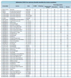 Cada institución decide si, en desmedro de la prueba, le dará más valor a las notas para elegir a sus futuros alumnos. Según el Mineduc, una de cada 4 carreras le bajó el peso a la PTU; en 48, hoy la trayectoria escolar vale más del 65% del puntaje total (ver tabla en la imagen).