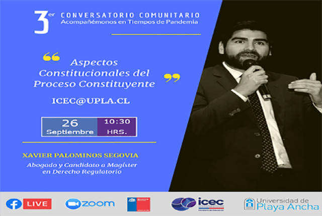 Con la exposición “Aspectos Constitucionales del Proceso Constituyente” dictada por el abogado y Mg.© en Derecho Regulatorio, Xavier Palominos Segovia, continúa el ciclo de Conversatorios Comunitarios “Acompañémonos en Tiempos de Pandemia”.