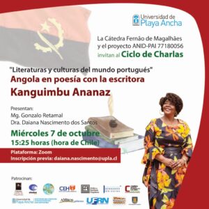 Con la participación de una destacada escritora de Angola, el miércoles 7 de octubre continuará el ciclo de charlas «Literaturas y culturas del mundo portugués», que organizan la Cátedra Fernando de Magallanes y el proyecto ANID-PAI 77180056, coordinados por la doctora Daiana Nascimento dos Santos, docente del programa de Doctorado en Literatura Hispanoamericana Contemporánea de la Universidad de Playa Ancha. Se espera la participación de estudiantes y profesores universitarios de literatura desde diversos países.
