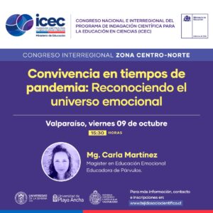 Con el Taller «Convivencia en tiempos de Pandemia: reconociendo el universo emocional», impartido por la Mg. en Educación Emocional y Educadora de Párvulos, Carla Martínez, continuaron las actividades del Congreso Interregional ICEC Zona Centro-Norte, coorganizado por las universidades Católica de Valparaíso, De la Serena y de Playa Ancha y sus respectivos programas de Indagación Científica para la Educación en Ciencias, ICEC.