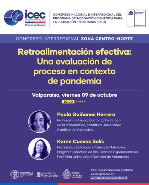 La programación del Congreso Interregional ICEC Zona Centro-Norte prosigue el viernes 9, a partir de las 10:00 horas, con la charla denominada “Retroalimentación Efectiva: Una evaluación de proceso en contexto de pandemia”, a cargo de la Dra. © Paula Quiñones Herrera, de la PUCV, y Mg. Karen Cuevas Solís, Coordinadora Ejecutiva Programa ICEC-UPLA.