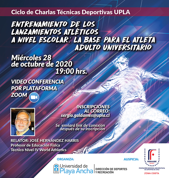 Este miércoles 28 de octubre, a las 19:00 horas, se llevará a cabo la quinta charla del ciclo, denominada «Entrenamiento de los lanzamientos atléticos a nivel escolar: La base para el atleta adulto universitario».