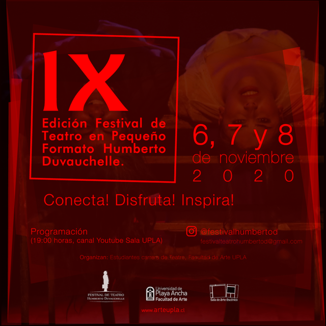 Entre el 6 y 8 de noviembre se desarrollará de manera virtual la IX Edición del Festival de Teatro Humberto Duvauchelle, oportunidad en que se presentarán los seis montajes en competencia a través del canal de Youtube de la Sala de Arte Escénico de la UPLA.