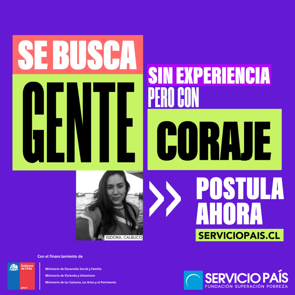 ¿Por qué se hace énfasis en que se busca gente con coraje? Porque los profesionales SERVICIO PAÍS de este 2020, desplegados en 100 comunas de todas las regiones de Chile, han debido enfrentar condiciones adversas, producto de la crisis sanitaria y social, y han sabido adaptarse y aportar de forma relevante en los territorios a los que fueron asignados. Se necesitan personas valientes, dispuestas a transformar, sorprenderse, revivir la esperanza y aportar a Chile para construir un mejor país.