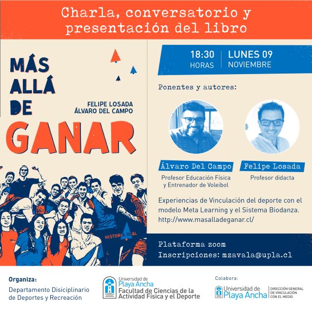 El Departamento Disciplinario de Deportes y Recreación, de la Facultad de Ciencias de la Actividad Física y del Deporte, invita a la charla y presentación del libro «Más allá de ganar», a cargo de sus autores, los profesores Álvaro del Campo Guzmán y Felipe Losada Carrasco.