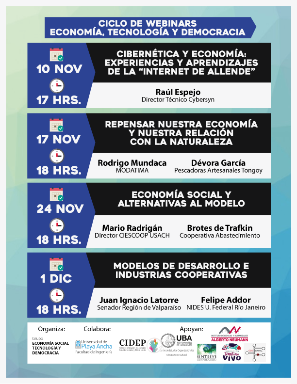 Con la charla “Cibernética y Economía: experiencias y aprendizajes de la ‘internet de Allende’” a cargo del Director Técnico de Cybersyn, Raúl Espejo, se dio inicio al ciclo de webinars «Economía, Tecnología y Democracia».