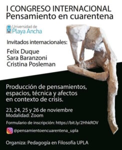 Se trata de un evento que reunirá a destacados expositores nacionales e internacionales, tales como Félix Duque, Sara Baranzoni y Cristina Pósleman, quienes realizarán distintas reflexiones en torno a la realidad social de vivir en contexto de pandemia.