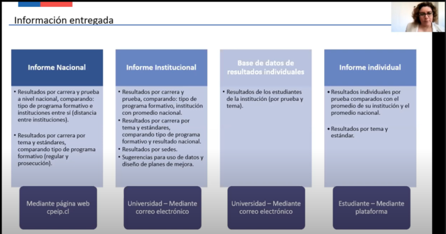 Las profesionales del CPEIP entregaron información, especialmente, a los futuros profesionales de la educación, referida a la evaluación nacional diagnóstica que debe ser rendida en forma obligatoria para obtener el título, no obstante hoy se encuentra suspendida por la pandemia.