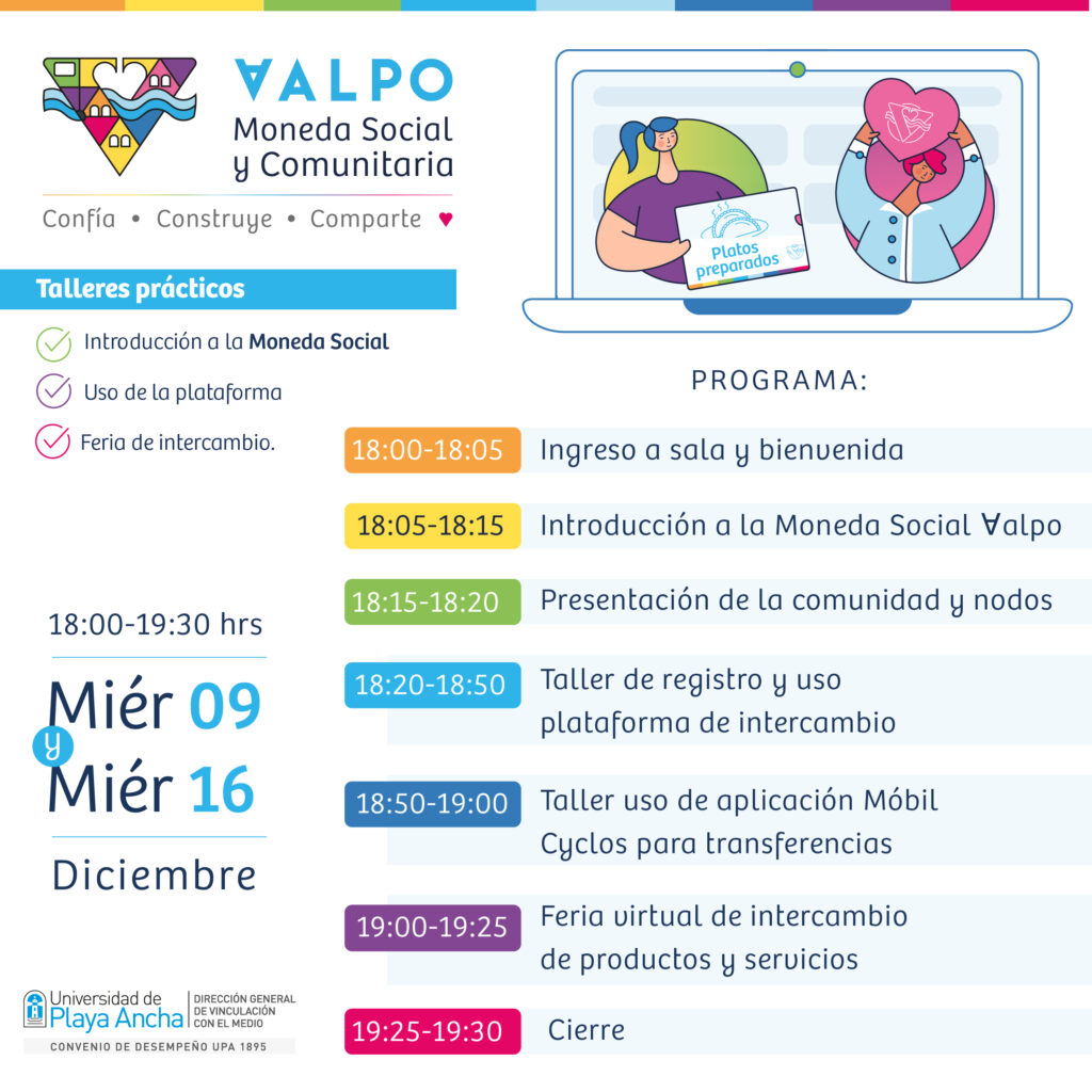 En poco más de una hora, por medio de Zoom, los interesados conocerán de manera sucinta cómo surge y cuáles son los objetivos de esta moneda social, cómo se hace el registro en valpomonedasocial.cl para acceder al catálogo de productos y finalmente cómo se hace el intercambio y transacción de ∀alpo a través de la plataforma.