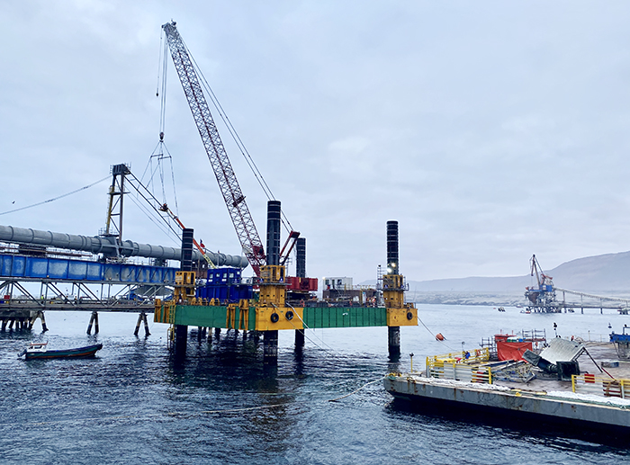 “El desafío mayor se presentó al desmantelar el shiploader antiguo, ya que constaba de 7 módulos, los que se debían separar sobre aguas marinas y cargar sobre pontones para ser transportados hacia Iquique y proceder a la disposición final del equipo. El riesgo que teníamos era la caída de concentrado de cobre sobre aguas marinas, por lo que se hizo una limpieza del interior del shiploader antiguo con el fin de sacar la acumulación de carga, se sellaron internamente con carpas de PVC y fueron aseguradas, con el fin de que la carpa no se rompiera con el viento y el agua y no se generara pérdida de material durante el camino”, detalló la profesional.