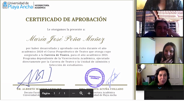 En una significativa ceremonia virtual, 10 estudiantes secundarios de la Región de Valparaíso fueron certificados por desarrollar y aprobar con éxito el Propedéutico en Línea de Teatro, instancia que les aseguró cupos reservados (matrícula) para ingresar a la carrera que imparte el Departamento de Artes Escénicas de la Facultad de Arte de la UPLA, sin importar el puntaje que obtengan en la PTU (Prueba de Transición Universitaria).