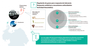 En el caso de P. endiviifolia, se observó un aumento en la expresión de las enzimas antioxidantes testeadas (superóxido dismutasa, ascorbato peroxidasa y glutatión reductasa), principalmente a los tres días de exposición a incrementos de temperatura. Asimismo, se estudió la expresión de 5 hsp de distinta masa molecular; la mayoría de estas hsp mostraron mayores niveles de expresión a los tres y cinco días de exposición a 8°C en comparación a temperatura control de 2 °C. Un resumen infográfico de los principales hallazgos puede verse en la figura 2.