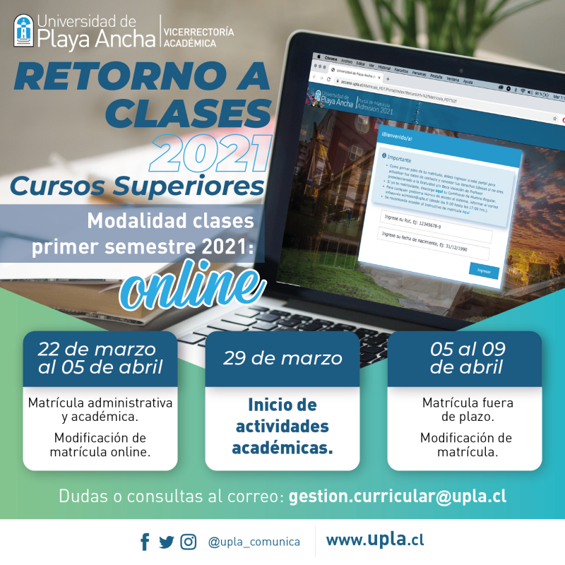 En el contexto en el que nos encontramos, la UPLA decidió mantener las clases virtuales hasta que las condiciones sanitarias y de seguridad permitan retornar sin peligro de manera presencial. Sin embargo, podría darse el caso de que ciertas actividades, como laboratorios o talleres, pudieran ser presenciales, siempre y cuando sea algo estrictamente necesario, y se mantengan todos los resguardos correspondientes.