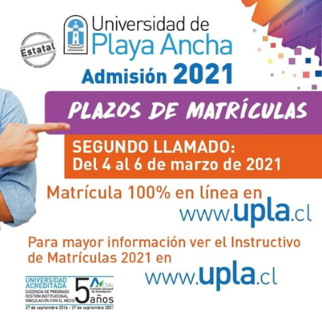 Para más información y consultas, contactarse con matricula.2021@upla.cl y a los teléfonos +56 9 59342869 / +56 9 59342886 / +56 959342892 / +56 959342862
