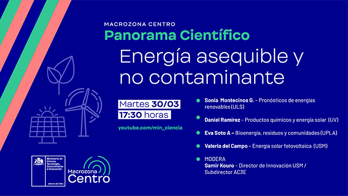 Durante el mes de marzo “Panorama Científico” tendrá lugar el martes 30 a las 17:30 horas y su foco será el Objetivo de Desarrollo Sostenible (ODS) «Energía Asequible y no Contaminante». La actividad será moderada por Samir Kouro, Director de Innovación USM y Subdirector del AC3E, y será transmitida canal de YouTube de Minciencia.