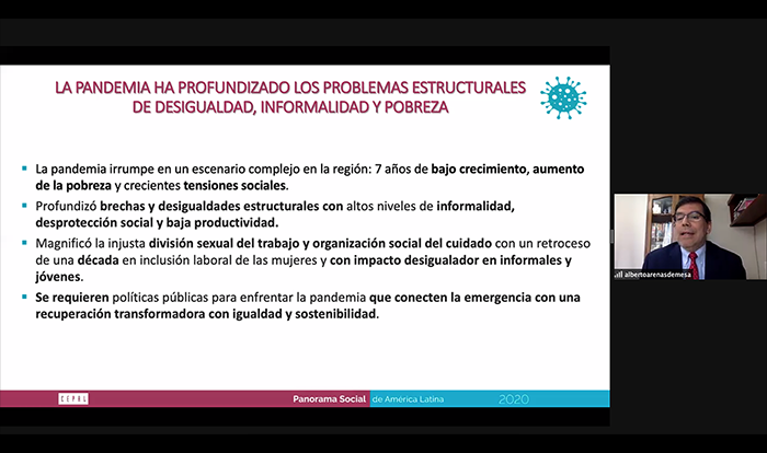 “La CEPAL está proponiendo que las transferencias de protección social de emergencia se mantengan durante 2021. Es muy importante que estas transferencias y estos esfuerzos de emergencia requieren aumentar la suficiencia de las prestaciones y deberían cubrir al menos la línea de la pobreza y en ese contexto avanzar a lo que nosotros hemos llamado un Estado de Bienestar con acceso universal a la salud, a educación de calidad, a los sistemas integrales de cuidado y a sistemas universales, integrales y sostenibles de protección social en la región”, explicó el Dr. Arenas.