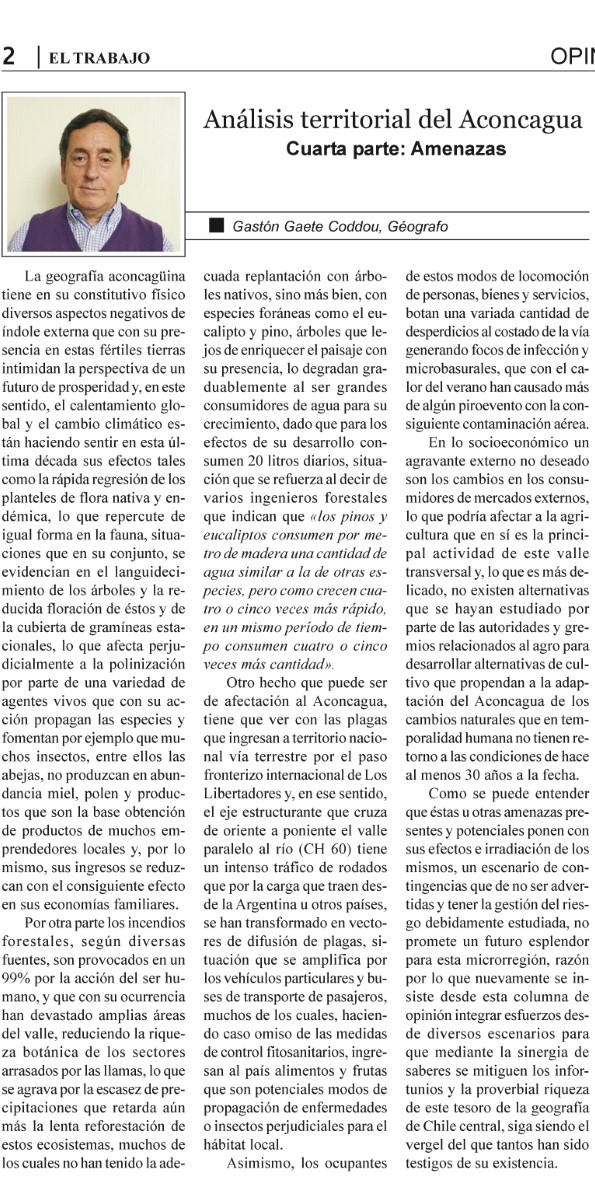 «La geografía aconcagüina tiene en su constitutivo físico diversos aspectos negativos de índole externa, que con su presencia en estas fértiles tierras intimidan la perspectiva de un futuro de prosperidad y, en este sentido, el calentamiento global y el cambio climático están haciendo sentir en esta última década sus efectos, tales como la rápida regresión de los planteles de flora nativa y endémica lo que repercute de igual forma en la fauna. Situaciones que, en su conjunto, se evidencian en el languidecimiento de los árboles y la reducida floración de estos, y de la cubierta de gramíneas estacionales. Todo aquello afecta perjudicialmente a la polinización por parte de una variedad de agentes vivos, que con su acción propagan las especies y fomentan, por ejemplo, que muchos insectos, entre ellos,  las abejas no produzcan en abundancia miel, polen y  productos que son la base de obtención de productos  de muchos emprendedores locales y, por lo mismo, sus ingresos se reduzcan con el consiguiente efecto en sus economías familiares.