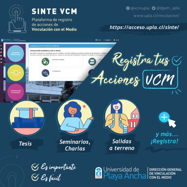 Karla Armingol, coordinadora de la Unidad, explicó: “El registro y la sistematización de las acciones de vinculación con el medio es fundamental para la retroalimentación de los procesos en esta materia, con los datos podemos hacer mediciones sobre su contribución en el medio externo e interno, además de realizar seguimiento de las interacciones con el entorno, de modo que podamos tener resultados y líneas bases que permitan tomar decisiones para futuras iniciativas. En ese sentido, la Dirección General de Vinculación con el Medio busca apoyar esta tarea por medio de la plataforma virtual SINTE VCM, que permite a académicas y académicos realizar un registro oportuno, rápido y sencillo”.