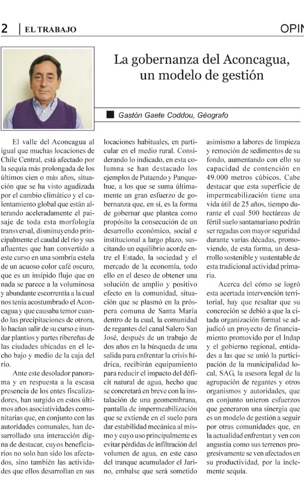 Considerando lo indicado, en esta columna se han destacado los ejemplos de Putaendo y Panquehue a los que se suma últimamente un gran esfuerzo de gobernanza que, en sí es la forma de gobernar que plantea como propósito la consecución de un desarrollo económico, social e institucional a largo plazo, suscitando un equilibrio acorde entre el Estado, la sociedad y el mercado de la economía. Todo lo anterior, en el deseo de obtener una solución de amplio y positivo efecto en la comunidad, situación que se plasmó en la próspera comuna de Santa María, dentro de la cual la comunidad de regantes del canal Salero San José, después de un trabajo de dos años en la búsqueda de una salida para enfrentar la crisis hídrica, recibirán equipamiento para reducir el impacto del déficit natural de agua, hecho que se concretará en breve con la instalación de una geomembrana, pantalla de impermeabilización que se extiende en el suelo para dar estabilidad mecánica al mismo y cuyo uso, principalmente, es evitar pérdidas de infiltración del volumen de agua, en este caso del tranque acumulador el Jarino.