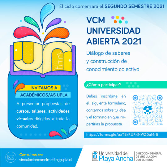 La Dirección General de Vinculación con el Medio, a través de la Unidad de Innovación Social (UIS), de la universidad abrió la convocatoria para que académicos y académicas de nuestra casa de estudios postulen propuestas de cursos o charlas a la U ABIERTA 2021, iniciativa que pretende acercar el conocimiento en distintas áreas a la comunidad local y nacional.