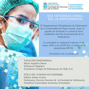 Con la conferencia titulada «Ética del cuidado en pandemia» a cargo de doctora Edilma Suarez Castro, docente de la Universidad Católica Javeriana de Colombia, la Universidad de PLaya Ancha celebrará el Día Internacional de la Enfermería.