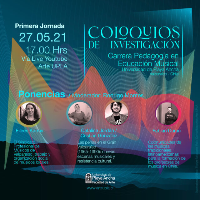 Cuatro investigadores nacionales conformarán el panel de conversación de la primera jornada de “Coloquios de investigación de la carrera de Pedagogía en Educación Musical UPLA”, la que se desarrollará virtualmente el jueves 27 de mayo, a las 17:00 horas, y será transmitida por el canal de YouTube y Facebook de la Facultad de Arte.
