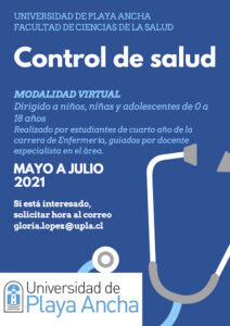 Así lo explicó la directora del Departamento de Enfermería, Patricia González Vega, quien precisó que esta atención se realiza en el marco de una asignatura de práctica profesional que normalmente se hace en los centros de Salud de Atención Primaria de la región. En contexto de pandemia, algunas actividades curriculares, como los controles de salud, se desarrollan de manera virtual, lo que se complementa con la integración de estudios de casos clínicos con software de simulación digital muy bien desarrollados.