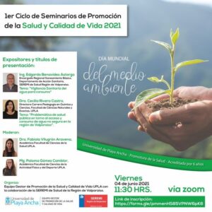 Con ocasión del Día Mundial del Medio Ambiente, el viernes 4 de junio, a las 11:30 horas y por la plataforma Zoom, continuará el Primer Ciclo de Seminarios de Promoción de la Salud y Calidad de Vida 2021, organizado por el Equipo Gestor de Promoción de la Salud y Calidad de Vida de la Universidad de Playa Ancha y la Secretaría Regional Ministerial de Salud.