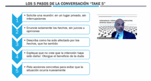 Francisco Espejo también explicó un mecanismo para estructurar las conversaciones en caso de supuestas ofensas. La llamó “Take 5” en referencia a la importancia de “tomarse cinco minutos” antes de responder y para las respuestas. También considera 5 pasos: 1) pedir una reunión entre ambas partes lo antes posible, pero dando tiempo para que se calmen; 2) enumerar los hechos, sin juicios ni opiniones; 3) describir cómo esos hechos afectaron a la persona, como la ofensa o discriminación que sintió; 4) otorgar al otro el beneficio de la duda, lo que generalmente se traduce en disculpas sinceras, ya que la otra persona no se siente “obligada” a defenderse; y 5) pedir acciones concretas de cambio, para que la situación se repita.