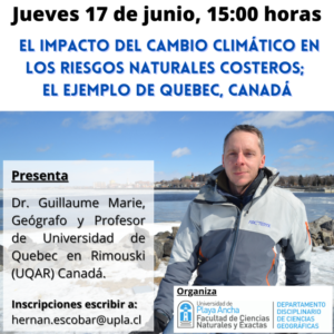 El Departamento Disciplinario de Ciencias Geográficas, dependiente de la Facultad de Ciencias Naturales y Exactas de la Universidad de Playa Ancha, invita a la conferencia titulada «El impacto del cambio climático en los riesgos naturales costeros: El ejemplo de Quebec, Canadá», que dictará el geógrafo y académico de la Universidad de Quebec, Dr. Guillaume Marie.