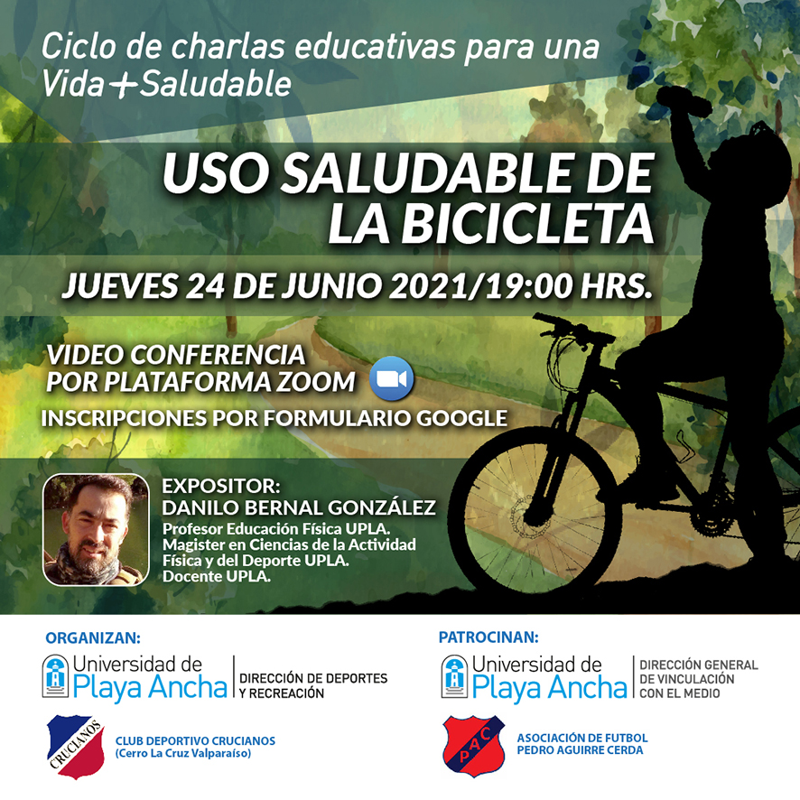 En esta oportunidad se desarrollará la charla «Uso saludable de la bicicleta», en el marco de la celebración de la campaña mensual UPLA+Saludable «Junio: Pedalea por el Medio Ambiente», y estará a cargo del académico de la Facultad de Ciencias de la Actividad Física y del Deporte de la Universidad de Playa Ancha, Mg. Danilo Bernal González.
