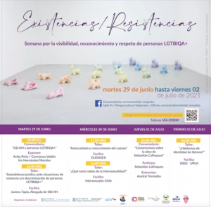 Entre el el 29 de junio y 2 de julio próximos se conmemorará el Día del orgullo gay, con la programación de un conjunto de actividades titulada “EXISTENCIAS/RESISTENCIAS, Semana por la visibilización, reconocimiento y respeto de personas LGTBIQA+”,  programa que incluye conversatorios y talleres. La invitación la extiende la Dirección de Equidad y Género de nuestra casa de estudios,  a través de la cual se busca abrir espacios de diálogo y aprendizajes en torno a las disidencias sexo genéricas, promoviendo una mirada crítica y comprometida con el respeto y valor de la diversidad. La propuesta se enmarca en las actividades que tanto en Chile como en otros países se realizan para conmemorar el orgullo LGTBIQA+.