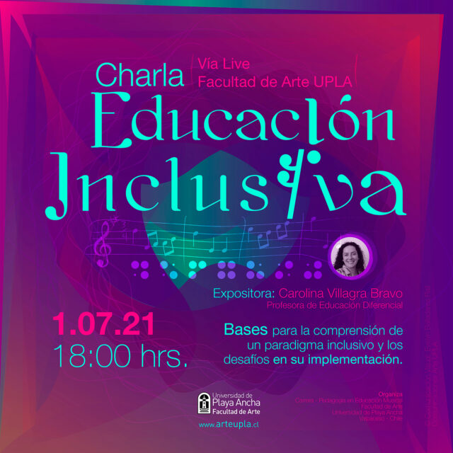 Dos interesantes charlas sobre inclusión y educación inclusiva desarrollará la carrera de Pedagogía en Educación Musical de la UPLA, cuya primera ponencia está fijada para el jueves 1 de julio, a las 18:00 horas, la que será transmitida por el Facebook de la Facultad de Arte de la Universidad de Playa Ancha.