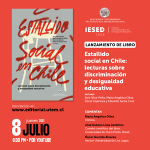 Ediciones de la Universidad Tecnológica Metropolitana y el Instituto Interuniversitario de Investigación Educativa, IESED-Chile, invitan al lanzamiento del libro «Estallido social en Chile: lecturas sobre discriminación y desigualdad educativa», de los editores Ilich Silva-Peña, María Angélica Oliva Ureta, Óscar Espinoza Díaz y Eduardo Santa Cruz Grau, investigadores titulares del IESED-Chile.